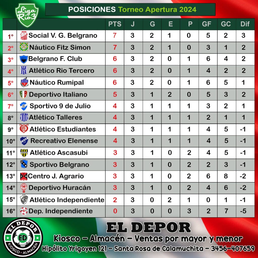 Atlético Río Tercero venció a Deportivo Huracán en la fecha previa al Superclásico y se ubicó como escolta al igual que Belgrano FC que derrotó por 4 a 2 a Estudiantes de Hernando.