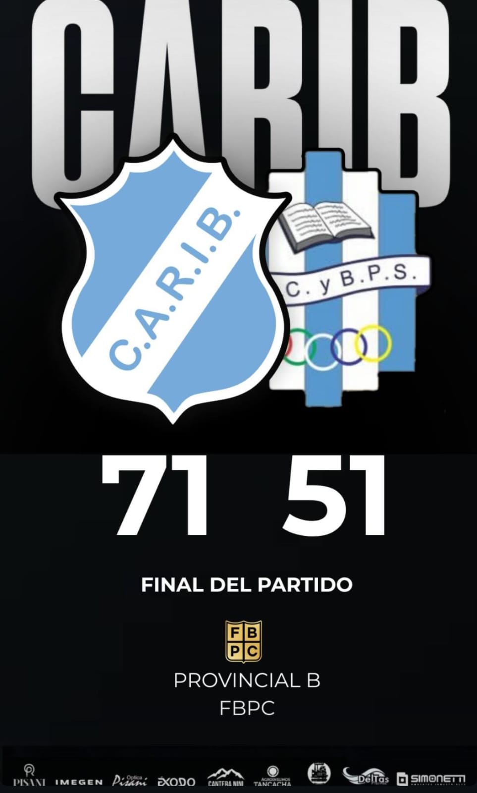 En una nueva jornada del Torneo Provincial B de la Federación de Básquetbol de la Provincia de Córdoba (FBPC), CARIB de Tancacha se impuso con claridad por 71 a 51 ante el Argentino de Pozo del Molle.El equipo local dominó desde el inicio, cerrando el primer cuarto 12-9 y estirando la ventaja al entretiempo con un 29-24 a su favor. En el tercer cuarto mostró su mejor versión ofensiva y defensiva, sacando una diferencia determinante (61-36). Finalmente, selló el triunfo con un sólido 71-51