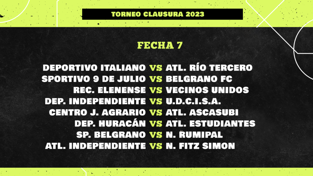TABLA DE POSICIONES: Sp. 9 de Julio 18; Dep. Huracán 15; Atl. Estudiantes 12; Atl. Río Tercero y Belgrano FC 11; Atl. Independiente 10; Atl. Ascasubi 9; Dep. Italiano 8; N. Fitz Simon 7; Centro J. Agrario, Rec. Elenense y Dep. Independiente 6; Sp. Belgrano 5; N, Rumipal 4; U.D.C.I.S.A. 3 y Vec. Unidos 2.