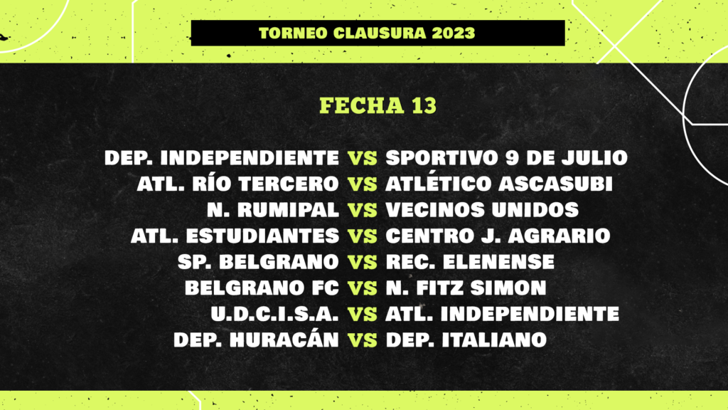 TABLA DE POSICIONES: Sp. 9 de Julio 34; Atl. Río Tercero y Dep. Independiente 22; Dep. Huracán 20; Atl. Ascasubi 19; Rec. Elenense y Belgrano FC 18; Sp. Belgrano 17; Centro J. Agrario 16; Atl. Estudiantes 15; N. Fitz Simon, Dep. Italiano y N. Rumipal 14; Atl. Independiente 13; Vec. Unidos 6 y U.D.C.I.S.A. 4