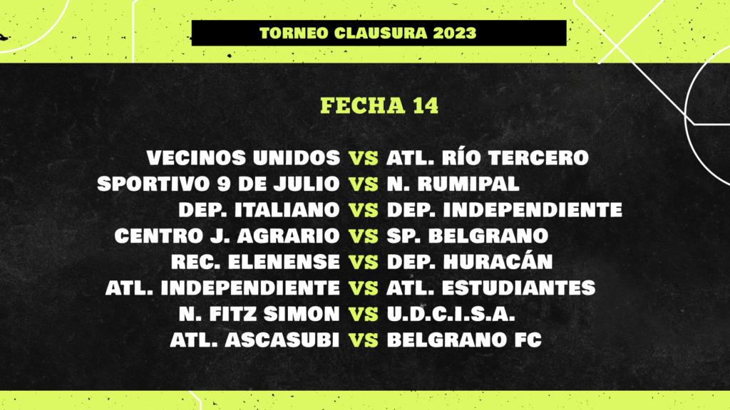 TABLA DE POSICIONES: Sp. 9 de Julio 37; Atl. Río Tercero 23; Dep. Independiente 22; Dep. Huracán y Belgrano FC 21; Atl. Ascasubi y Sp. Belgrano 20; Atl. Estudiantes y Rec. Elenense 18; N. Rumipal 17; Centro J. Agrario y Atl. Independiente 16; Dep. Italiano 15; N. Fitz Simon 14; Vec. Unidos 6 y U.D.C.I.S.A. 4