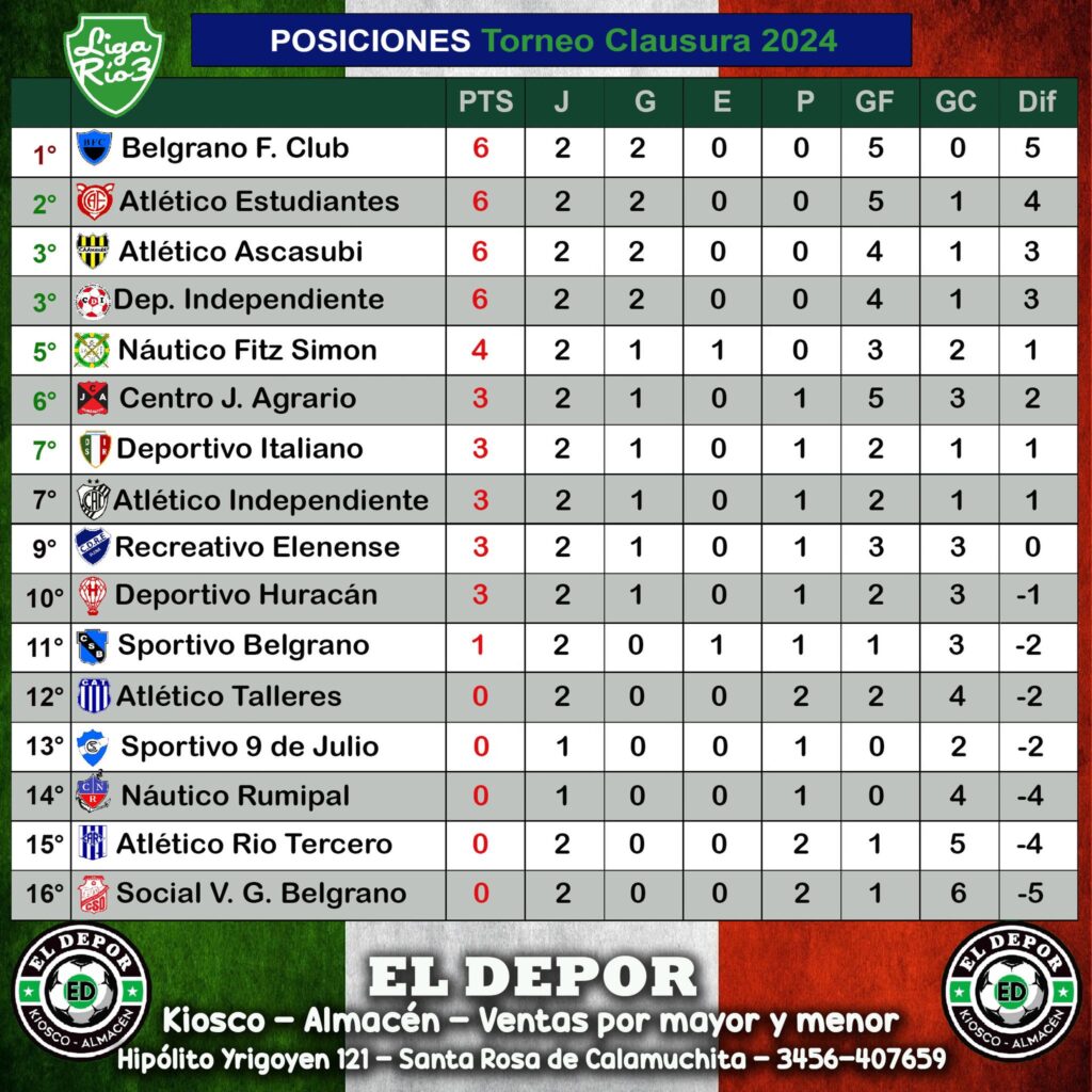 Belgrano FC, Deportivo Independiente, Atlético Estudiantes y Atlético Ascasubi habían ganado en la primera fecha y repitieron el éxito este domingo por lo que lideran con puntaje ideal.