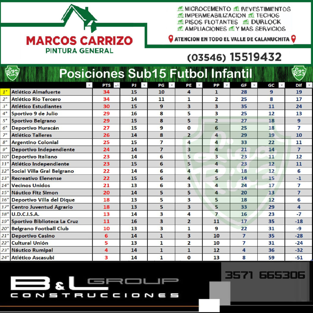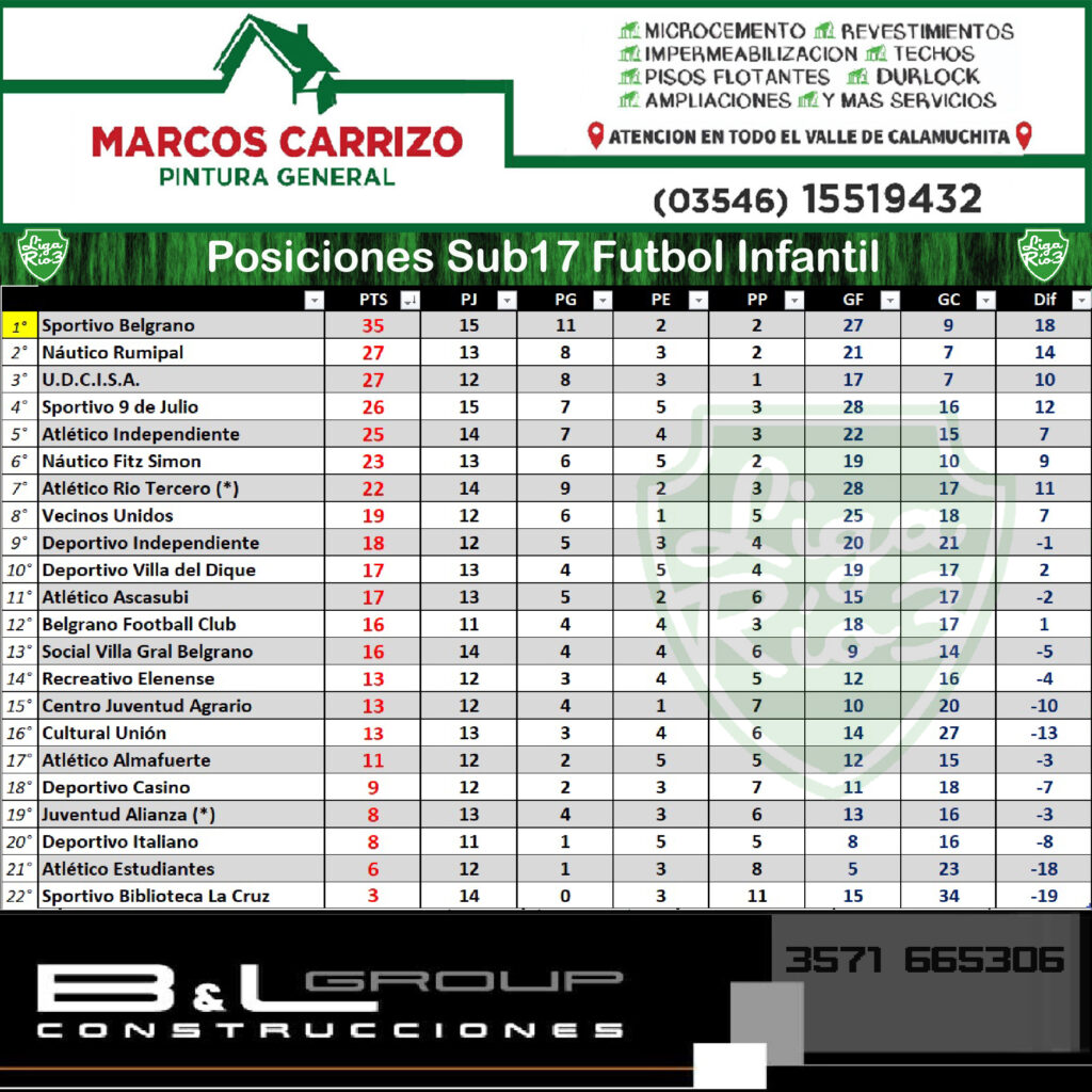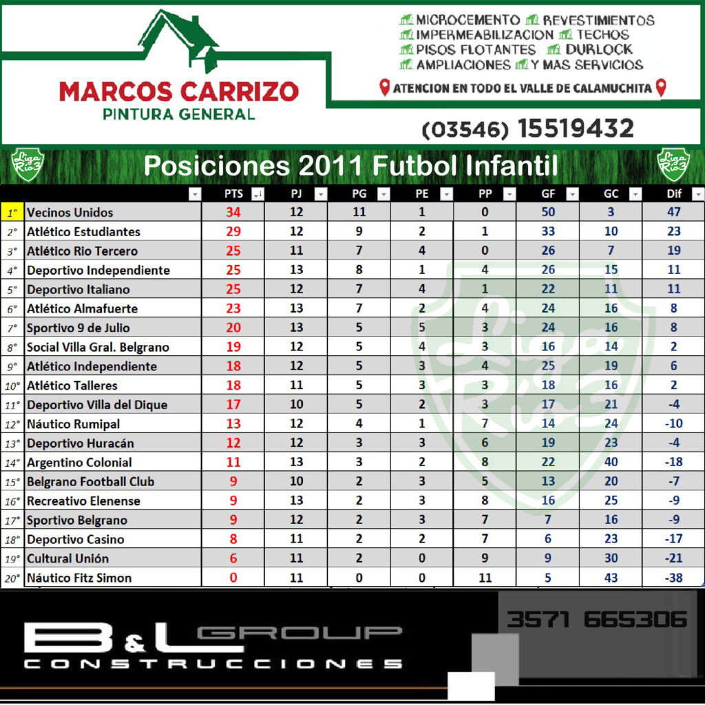 TABLA DE POSICIONES GENERAL DEL FÚTBOL INFANTIL – VÍA MAURICIO MARATTIN Y LIGARIOTRES