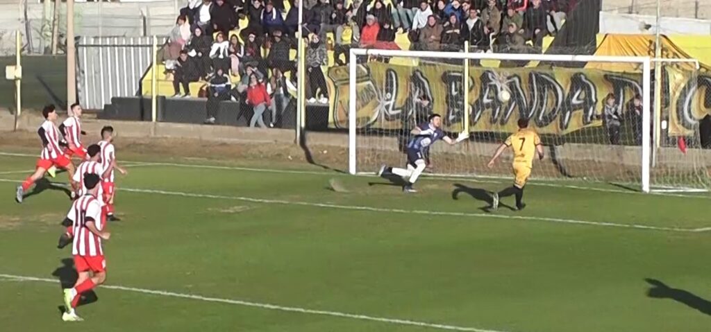 El partido comenzó favorable para el dueño de casa que tuvo la chance de abrir el marcador con una pena máxima que desperdició Axel “Petaca” Salgado con un disparo débil al medio del arco que fue controlado por Mauricio Albornós.