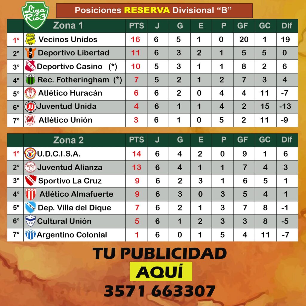 Por la Zona Llano, terminaron arriba Deportivo Libertad y Juventud Unida quienes ganaron este fin de semana y postergaron a Vecinos Unidos al tercer puesto en la tabla. En tanto, la Zona Sierra tiene a Atlético Almafuerte como líder pero mucha competitividad en las primeras cinco posiciones.