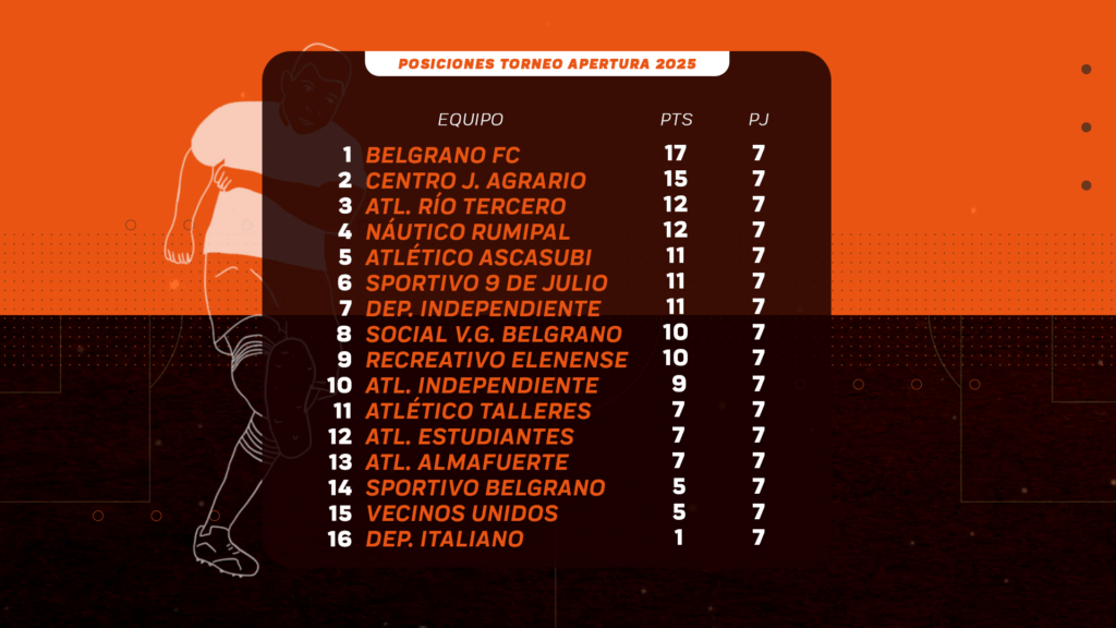Interesante fecha se disputó este fin de semana por el Círculo Superior de la Liga Regional Riotercerense y Belgrano FC sigue mostrando su poderío: superó por 3 a 2 a Deportivo Italiano como local y lidera las posiciones del Apertura 2025 con dos puntos de ventaja sobre Centro Juventud Agrario, que venció por la mínima diferencia a Social Villa General Belgrano.