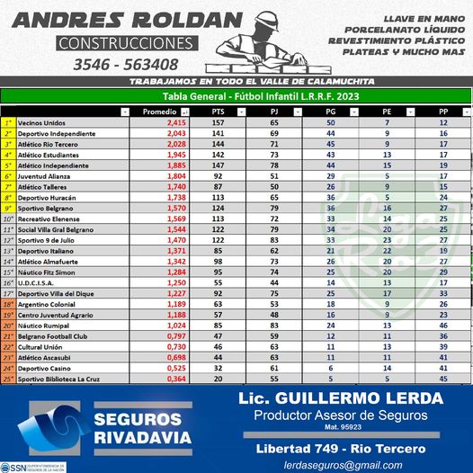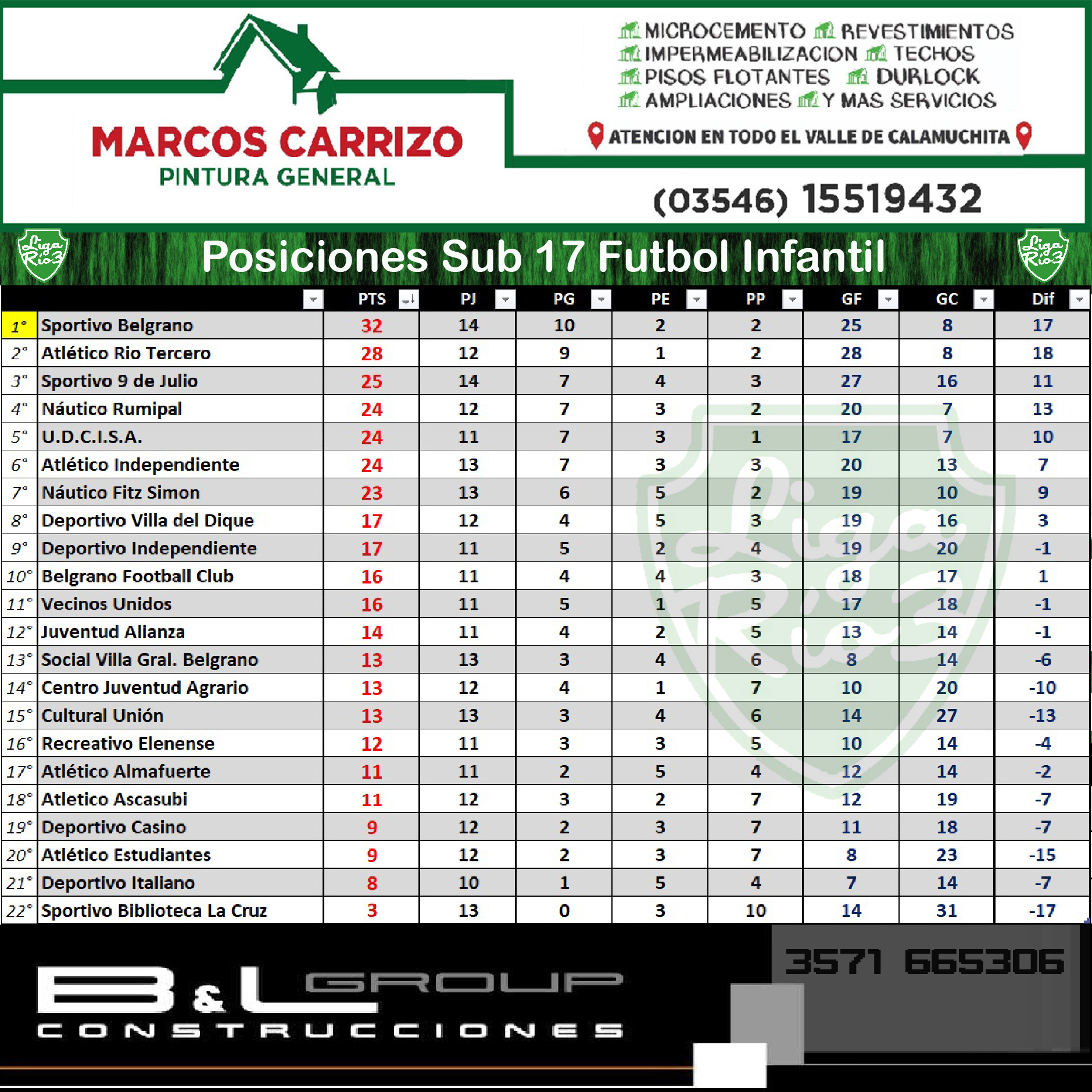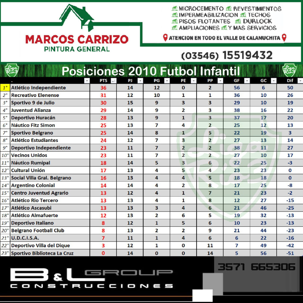 TABLA DE POSICIONES GENERAL DEL TORNEO DE FÚTBOL INFANTIL – VÍA MAURICIO MARATTIN Y LIGARIOTRES.COM